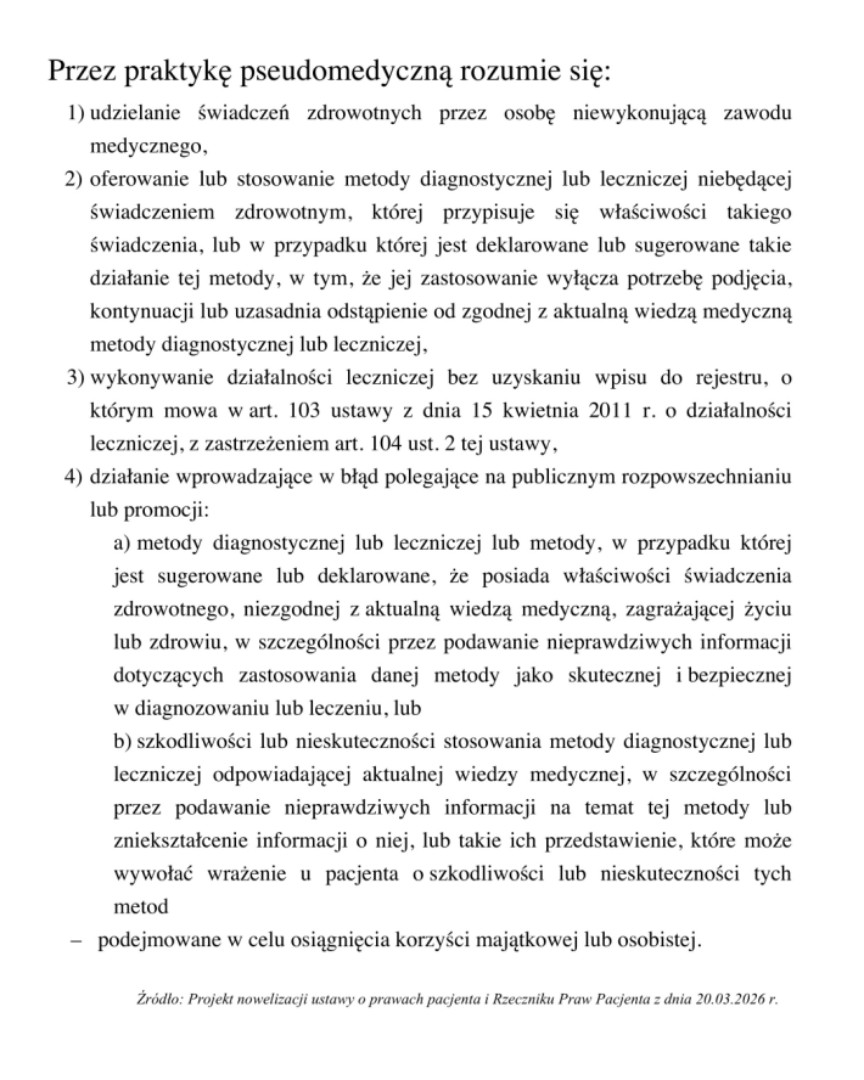 RPP podkreśla jednocześnie, że projektowane zmiany nie zakazują prowadzenia działalności gospodarczej żadnego rodzaju. – Zakazane ma być natomiast niezgodne z prawdą przypisywanie (sugerowanie, deklarowanie), oferowanym w ramach działalności usługom lub metodom, cech zgodnego z aktualną wiedzą medyczną świadczenia zdrowotnego, skutecznego w leczeniu chorób – czytamy w informacji opublikowanej przez Rzecznika Praw Pacjenta.